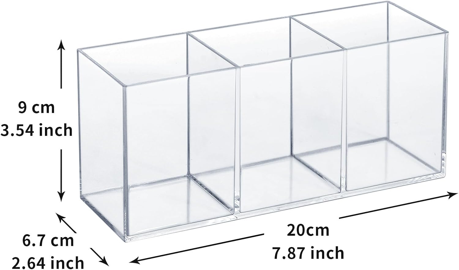 • Compact Size, Ample Capacity: Measuring 7.8” L x 2.56” W x 3.54” H, this acrylic caddy offers plenty of storage space without consuming your desk or counter. Its compact footprint fits nicely on any workspace – whether on a small dorm desk, a crowded kitchen countertop, or a bathroom shelf. (Approx. 19.7 x 6.5 x 9 cm in metric.) Despite its small size, the three sections can hold dozens of pens, pieces of flatware, or makeup tools, keeping your space clutter-free.